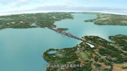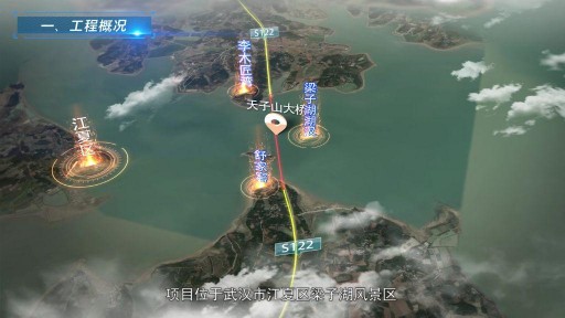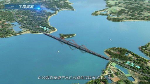 先说说这个天子山大桥,地处江夏梁子湖风景区,一边是碧波荡漾的湖水,一边是起伏的天子山,本身就自带“山水相融”的气质。我们不妨看看大田影视是怎么把这份气质融入动画的:开篇没有直接抛数据,而是用航拍镜头扫过江夏的人文画卷,“地占半楚,孝行天下”的底蕴随画面铺开,再自然过渡到大桥的三维模型。1808米的桥长、320米的主跨,这些关键数字不是冷冰冰地罗列,而是“贴”在对应的桥梁结构上动态呈现,连主桥“三拱五跨双拱肋”的复杂构造,都被拆解得明明白白。